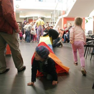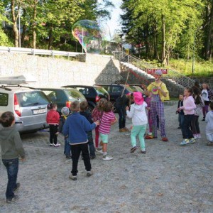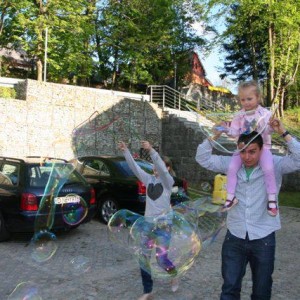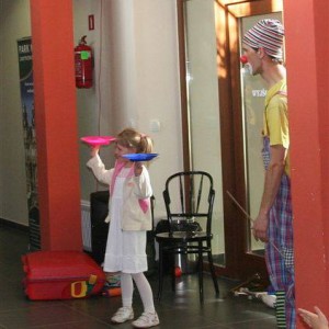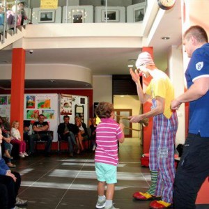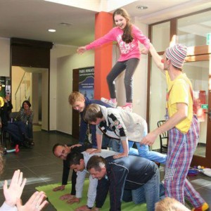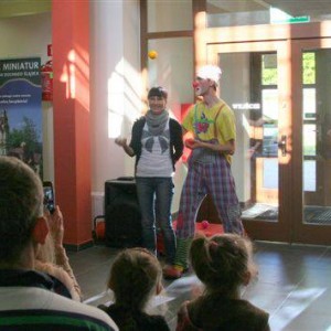 Na zakończenie odbył się pokaz klauna Rufi Rafi. Uczyliśmy się elementów sztuki cyrkowej: żonglowaliśmy piłeczkami, budowaliśmy ludzkie piramidy i podziwialiśmy tygrysi skok. Pokaz wielkich baniek i skręcanie balonów zakończył naszą Noc Muzeów.